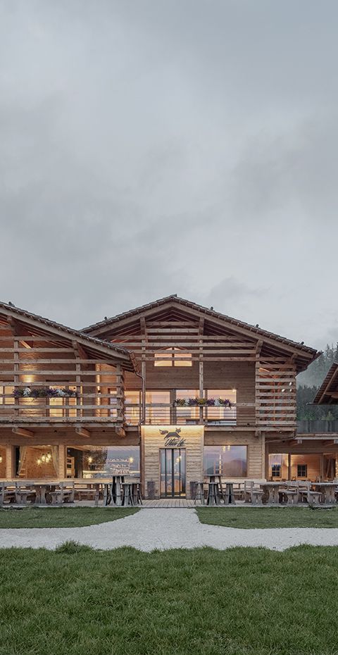 La Ütia Lé è posata sui prati ai piedi delle imponenti pareti rocciose del Sas dla Crusc, e richiama l’attenzione dell’escursionista grazie al suo aspetto armonico ed elegante, dovuto ai materiali naturali del legno e della pietra.